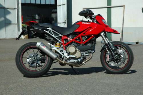 Impianto 2 in 2 compensato ad H + coppia terminali serie Magnum con fondello in magnesio presso fuso titanio tondo. Bocche di uscita laterali dx tipo motoGP. Vengono utilizzate le prime parti di collettore originale.